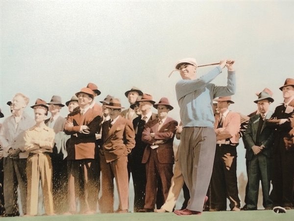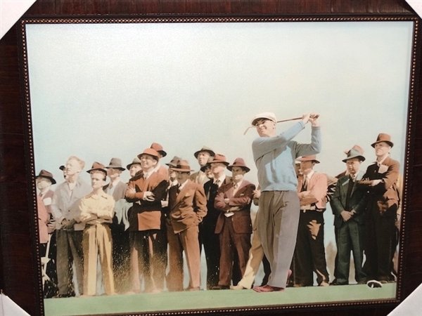 This is a deluxe canvas giclee of Ben Hogan winning his first PGA Tour event at Pinehurst No. 2 in 1940. Hogan is playing the difficult 5th hole at No. 2. This photo was colorized and is one of the more famous pictures taken at No. 2. This piece is framed, sized 26" x 32".